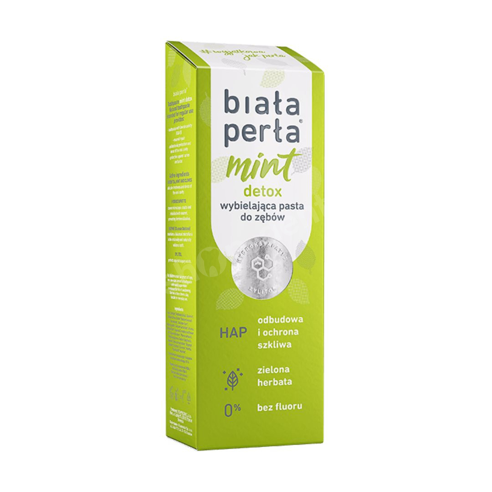 - Biała Perła Mint Detox to naturalna pasta do zębów bez fluoru. Posiada łagodny świeży smak mięty. Ma niezwykle niski współczynnik ścieralności, RDA=5. Dlatego to idealna propozycja dla osób o wrażliwych zębach.