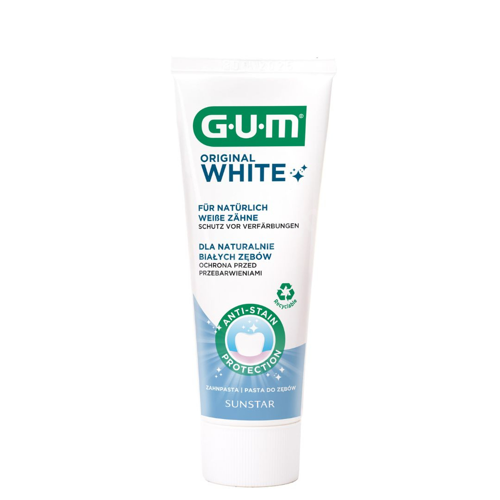 - Pasta GUM Original White w nowej, żelowej formule została opracowana z myślą o skutecznym, a jednocześnie bezpiecznym usuwaniu przebarwień. Udoskonalona formuła, pozbawiona dwutlenku tytanu, ma niższą ścieralność i jest jeszcze łagodniejsza dla szkliwa.