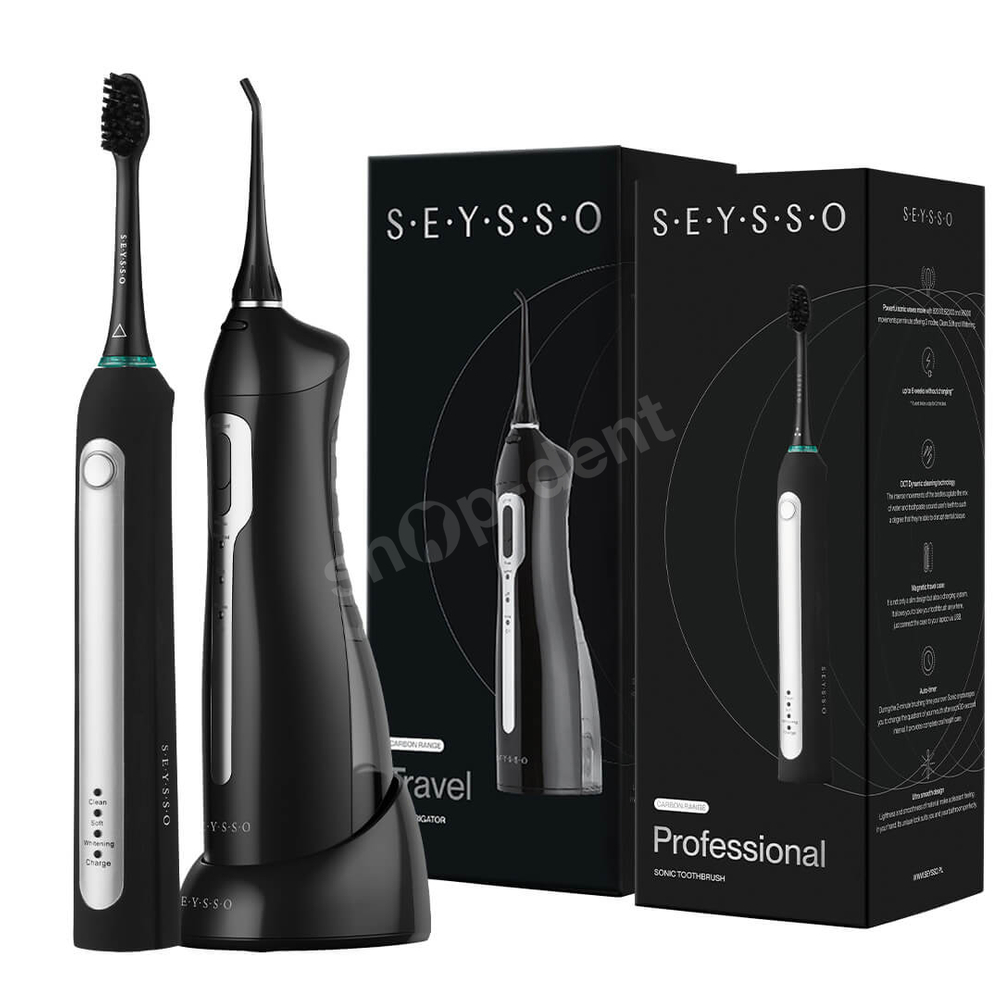 - Mega okazja! Kup zestaw SEYSSO Carbon. W komplecie: szczoteczka soniczna z 3 programami pracy i etui podróżnym oraz bezprzewodowy, irygator z szerokim zakresem ciśnienia wody i długim czasem pracy bezprzewodowej.